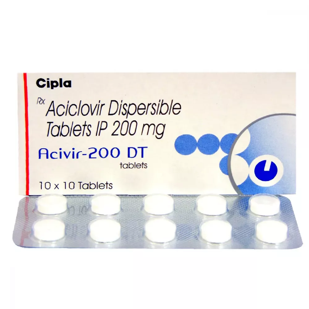 Acivir DT Tablet 200mg is an antiviral medicine used to treat viral infections such as herpes simplex infections (cold sores and genital herpes), shingles (herpes zoster), and chickenpox. It contains Acyclovir, which works by stopping the growth and spread of the virus, helping reduce the severity and duration of infection when taken as prescribed.