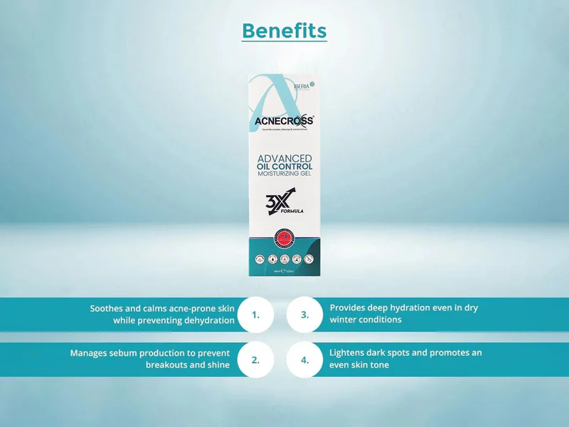 Acnecross Oil Control Gel is a topical skincare formulation designed to help manage oily skin and acne-prone conditions. It works by controlling excess sebum production, unclogging pores, and reducing the appearance of pimples, blackheads, and whiteheads, leaving the skin fresh and matte.
