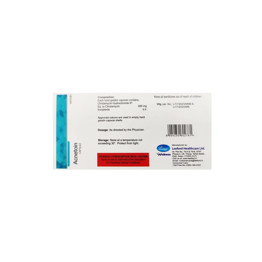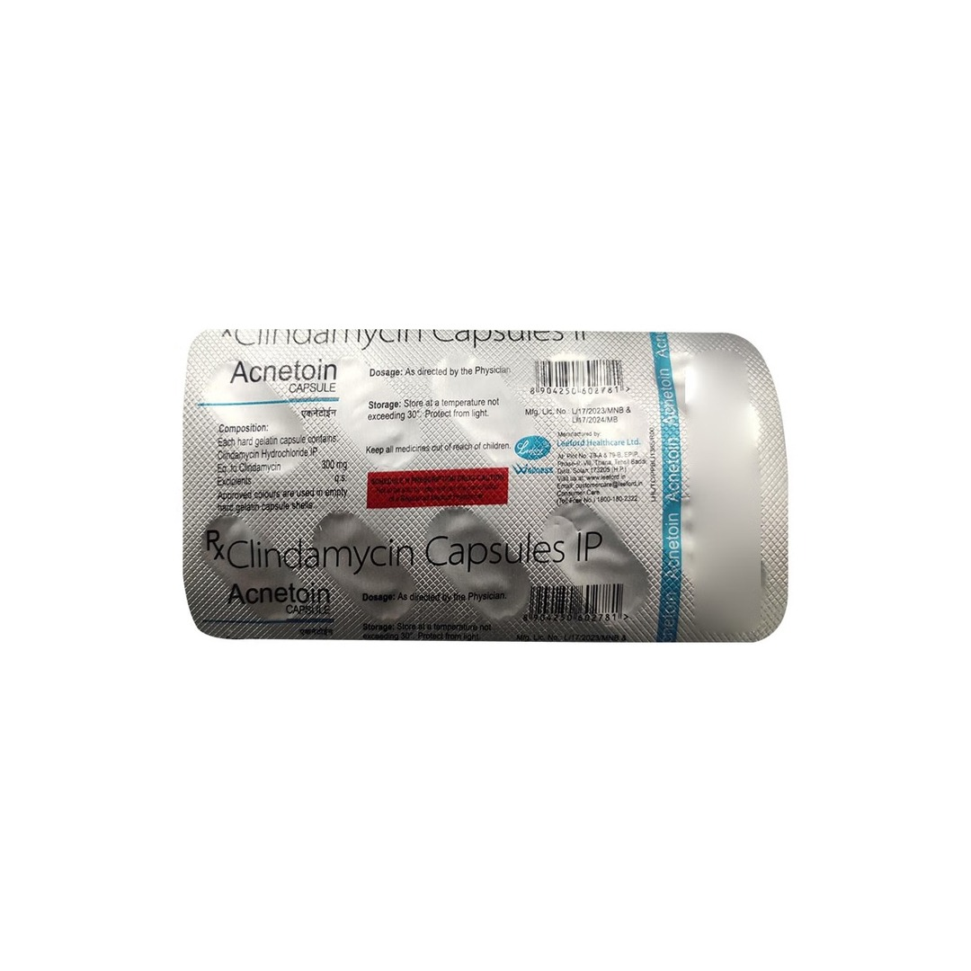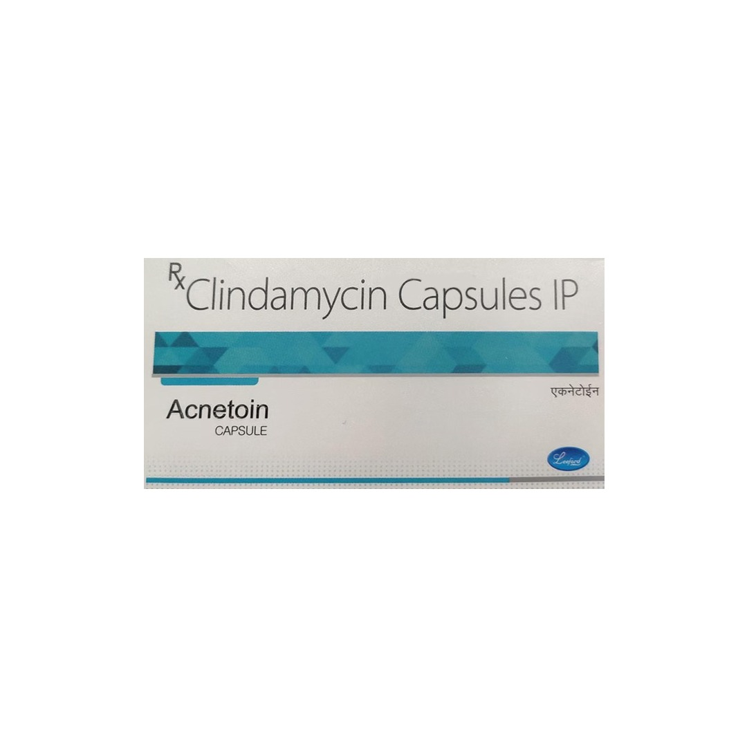 Acnetoin Clindamycin Capsules are an antibiotic medicine used in the treatment of moderate to severe acne and certain bacterial infections. It contains Clindamycin, which works by inhibiting the growth of acne-causing bacteria, helping reduce inflammation, redness, and pimples when taken as prescribed by a healthcare professional.