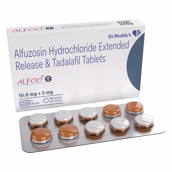 Alfoo‑T Tablet ER is a prescription combination medicine containing Alfuzosin and Tadalafil. It is used in adult men for the treatment of benign prostatic hyperplasia (BPH), a condition in which the prostate gland becomes enlarged, causing difficulty in urination, weak urine flow, or frequent need to urinate. :contentReference[oaicite:1]{index=1}