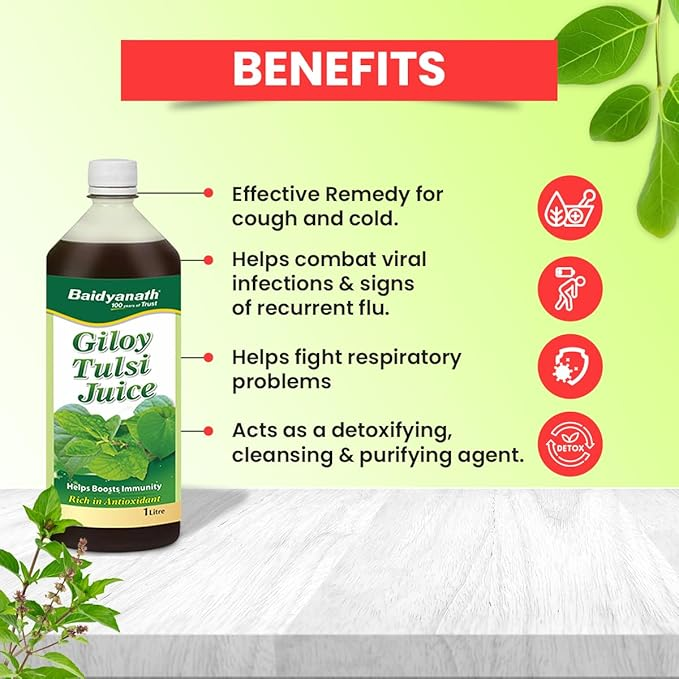 Baidyanath Giloy Tulsi Herbal Juice blends giloy and tulsi with natural excipients to support everyday wellness, immunity and digestion a refreshing, sugar-free tonic for daily use. Safe for adults.