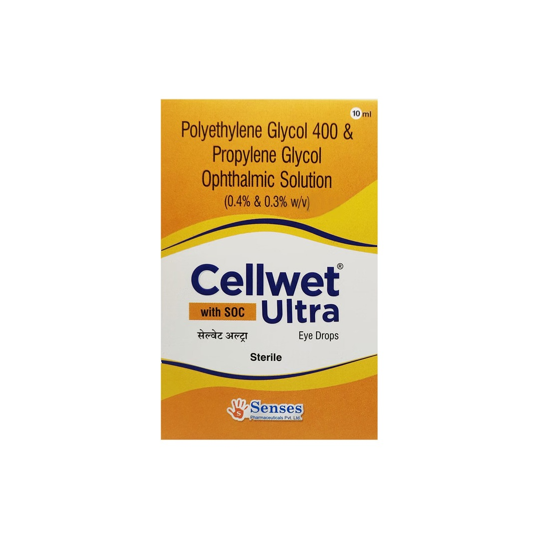 Cellwet Ultra Eye Drop is a lubricating ophthalmic solution formulated to provide long-lasting relief from dry, irritated, and tired eyes. It helps restore moisture, reduce burning sensation, and soothe discomfort caused by prolonged screen exposure, environmental pollution, or reduced tear production when used as directed.