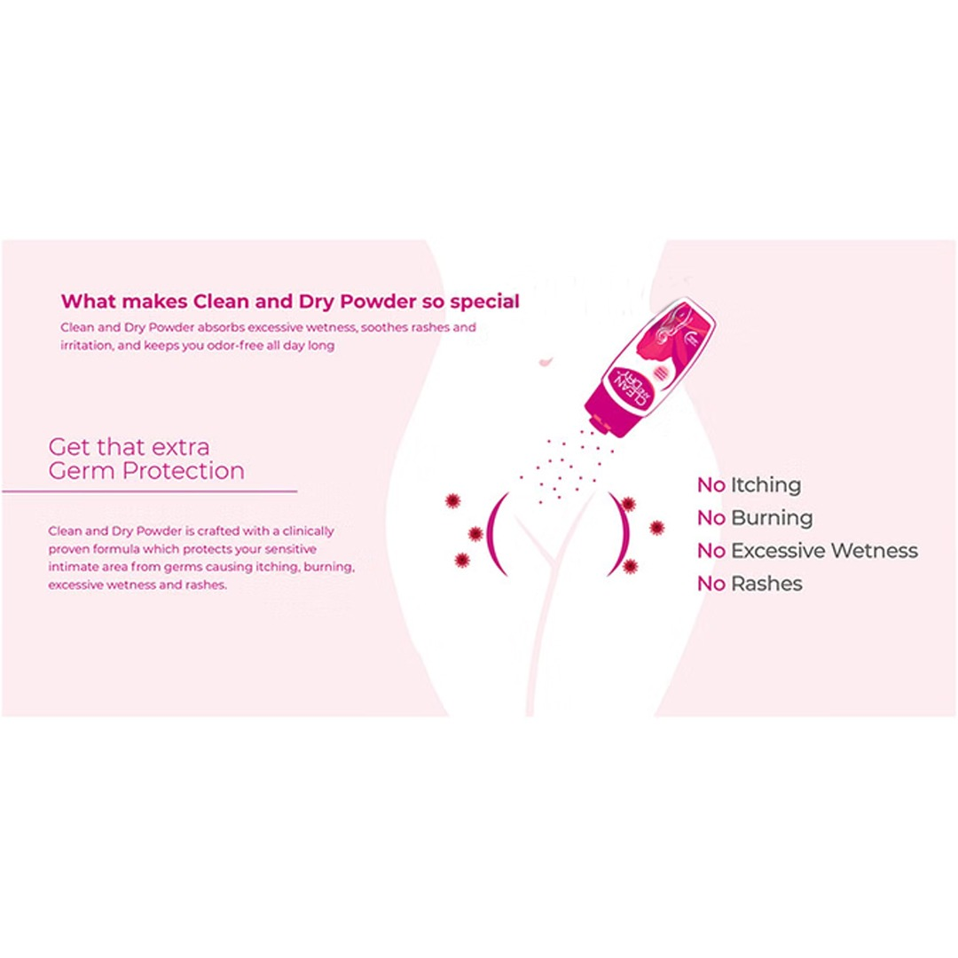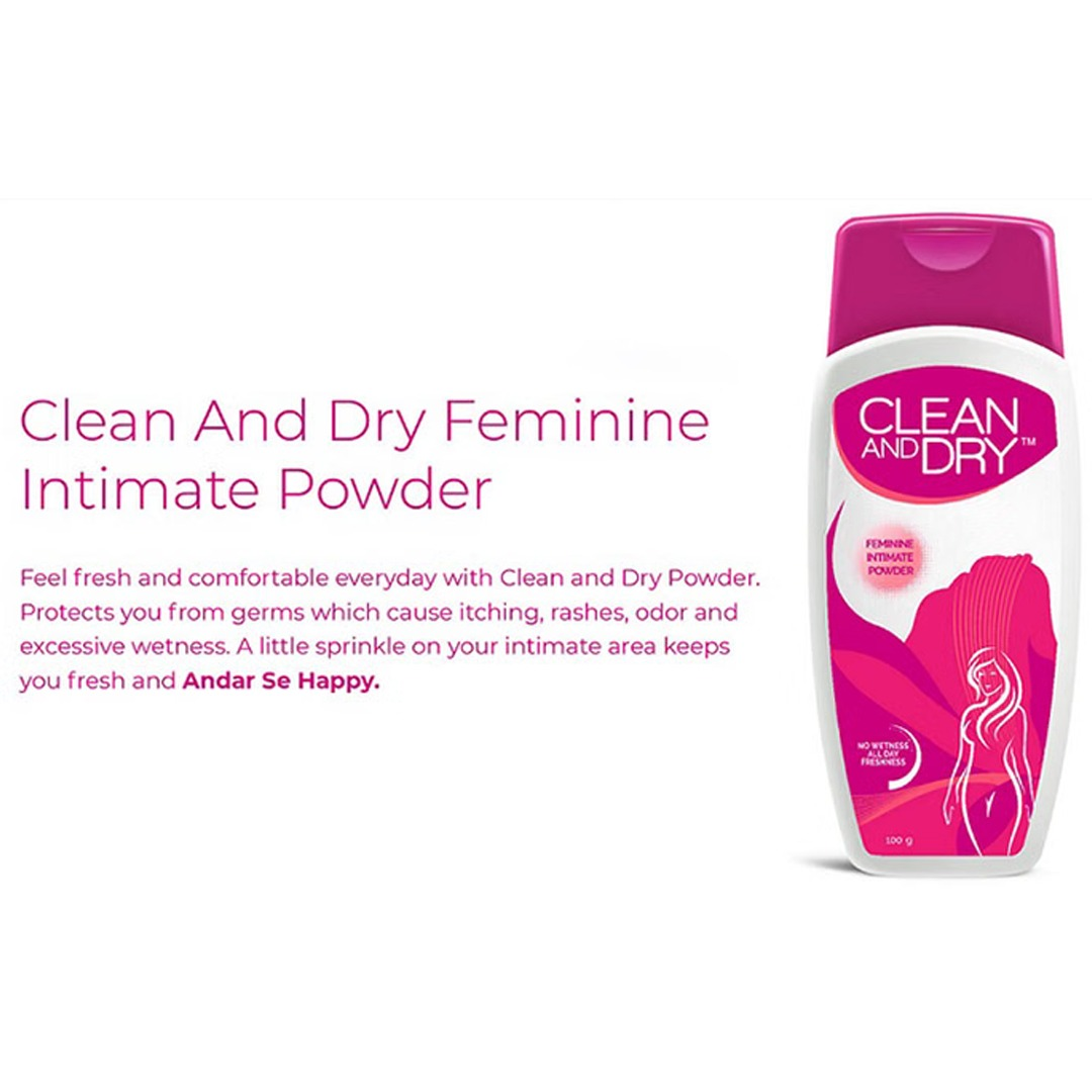 Clean and Dry Feminine Intimate Powder is specially designed to help keep the intimate area fresh, dry, and comfortable throughout the day. It helps absorb excess moisture, reduce unpleasant odor, and provide soothing relief from irritation and chafing, supporting everyday feminine hygiene when used as directed.