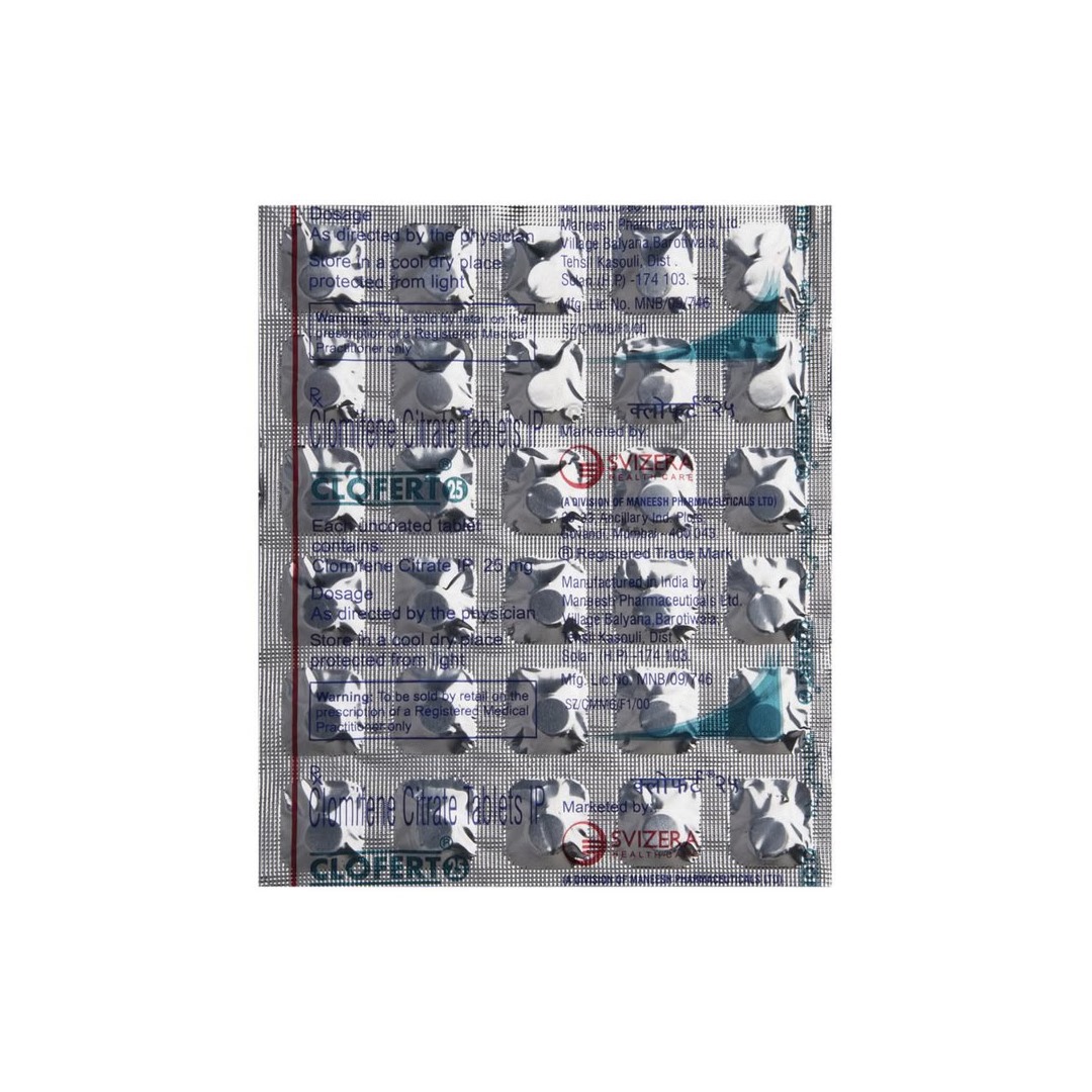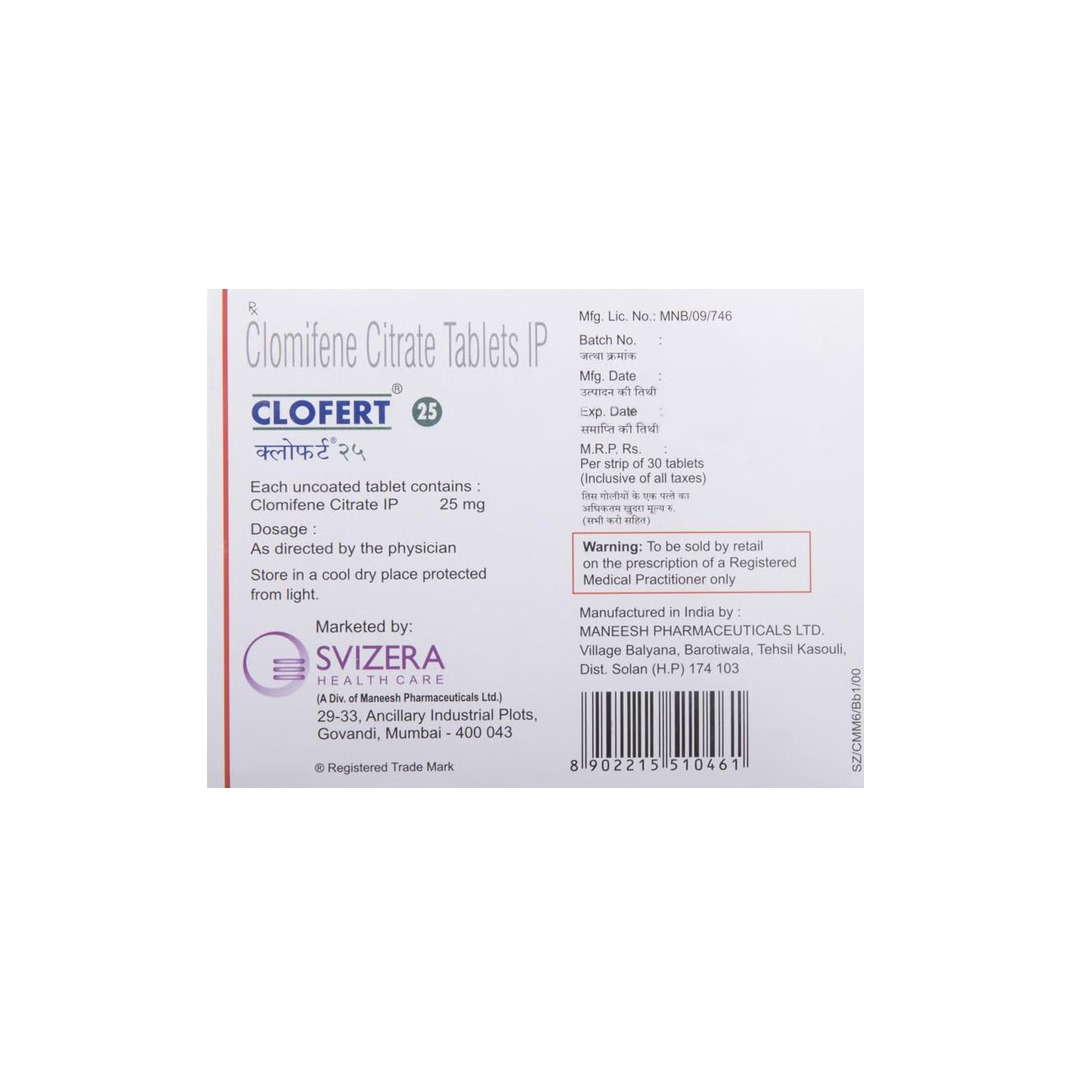 Clofert 25mg Tablet contains Clomiphene Citrate, a medication commonly used to treat infertility in women by stimulating ovulation. It works by regulating hormonal signals in the body to promote the development and release of eggs from the ovaries.