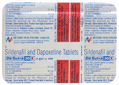 DA Sutra 30X Tablet combines Sildenafil 50mg and Dapoxetine 30mg, supporting improved sexual performance and satisfaction for adult men.