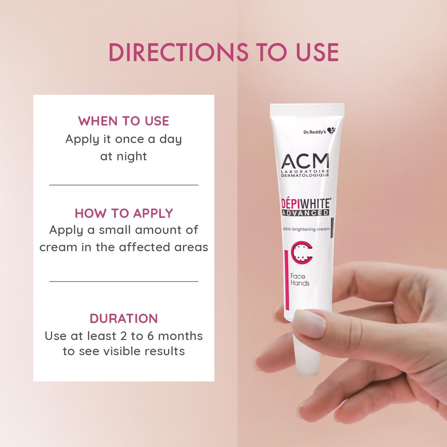 - Apply a small amount on clean, dry skin of the face, neck, or hands.
