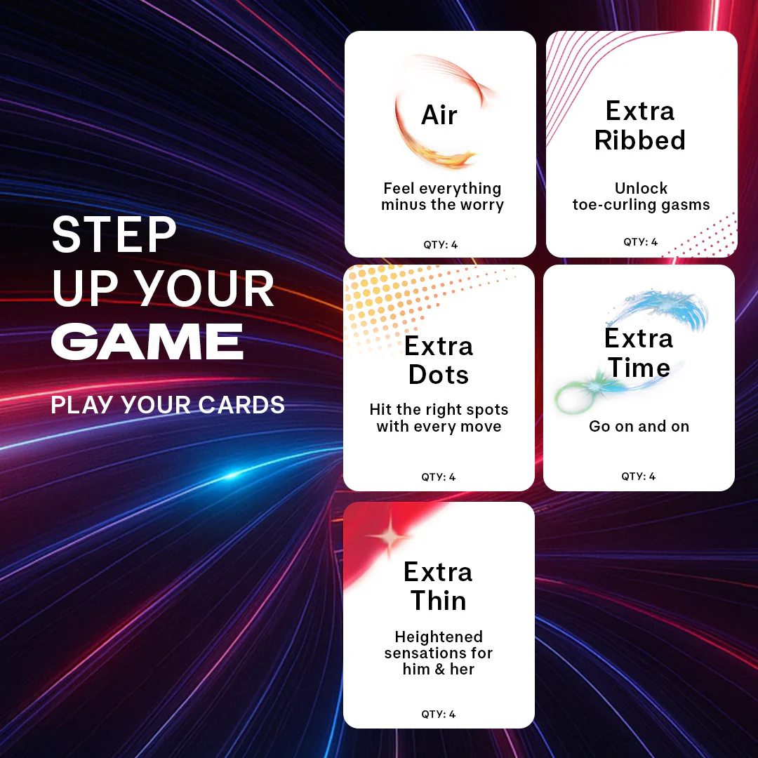 - Assorted pack with ribbed, dotted, and flavored condoms