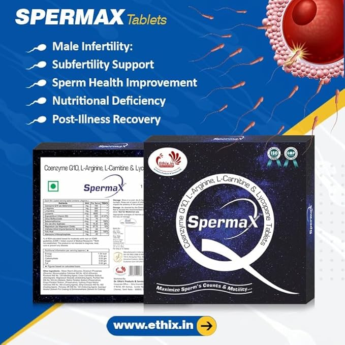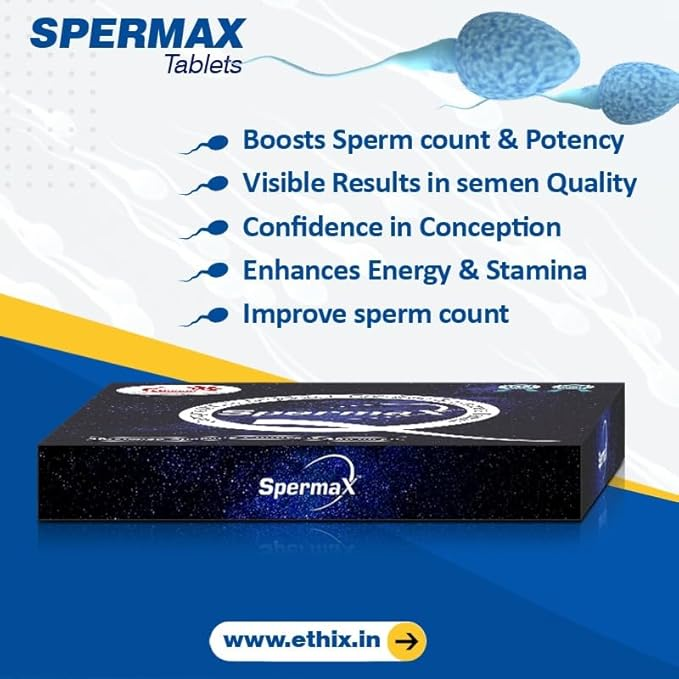 Ethix Spermax Tablet is a specialized nutritional supplement formulated to support male reproductive health and improve overall vitality. It features a comprehensive blend of amino acids, potent antioxidants, and essential minerals specifically chosen to enhance sperm quality, motility, and count. By reducing oxidative stress within the reproductive system, Spermax helps protect developing cells from free radical damage, which is a common factor in male infertility.