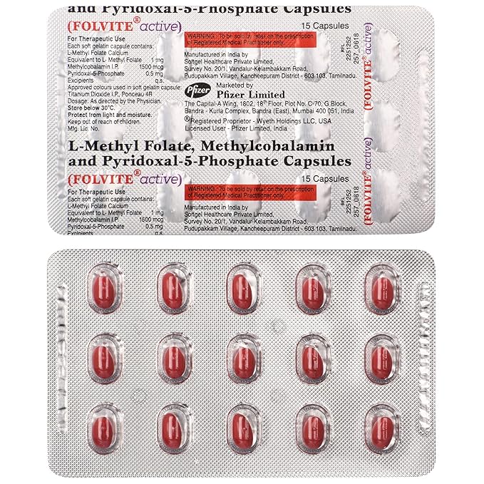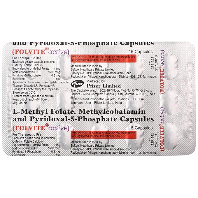 Folvite Active Capsule is a nutritional supplement containing active folate and essential vitamins. It is used to prevent and treat folate deficiency, support red blood cell formation, and maintain overall health. It is commonly prescribed during pregnancy to support fetal development and reduce the risk of neural tube defects.