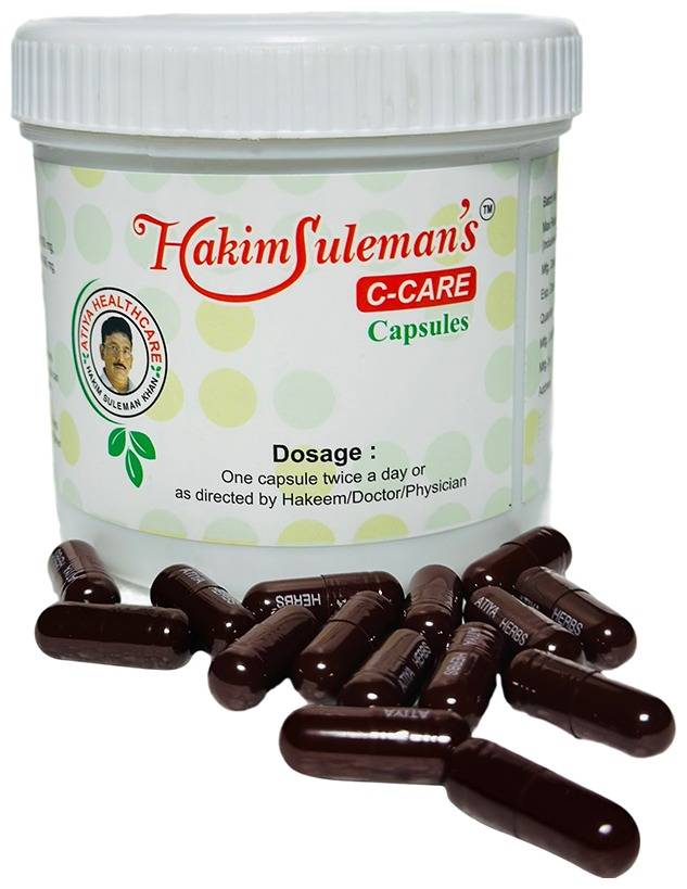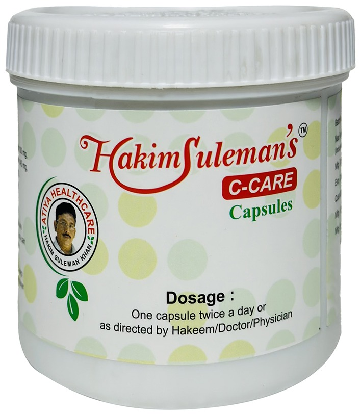 Hakim Suleman’s C. Care Capsule is a herbal Unani supplement formulated to support women’s reproductive health and hormonal balance. It may help regulate irregular menstrual cycles, support hormonal equilibrium, alleviate menstrual discomfort, and contribute to overall female wellness when taken as directed.