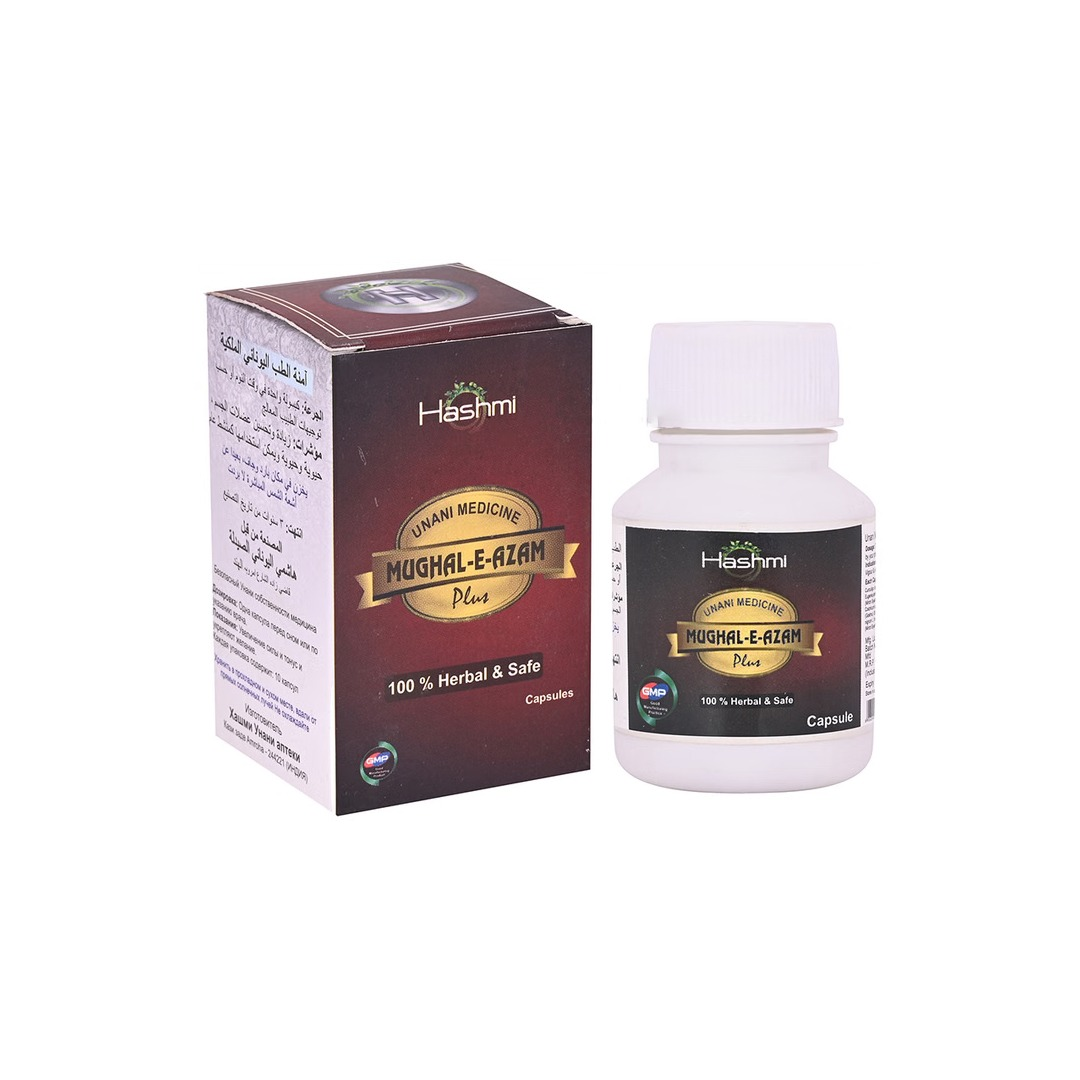 Hashmi Mughal-E-Azam Plus Capsule is a Unani herbal formulation developed to support male sexual wellness. It helps improve strength, stamina, and performance, and is commonly used for concerns related to erectile dysfunction, early ejaculation, and reduced vitality. Regular use as directed supports overall reproductive health and confidence.