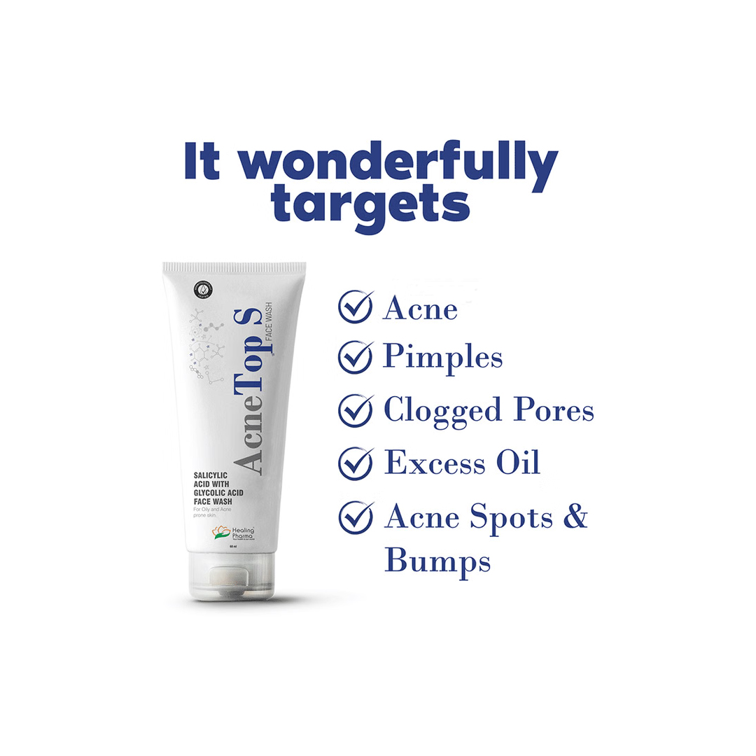 Healing Pharma AcneTop S Face Wash is a medicated facial cleanser formulated to help target acne-prone skin by removing excess oil, dirt, and impurities that contribute to breakouts. It works to cleanse deeply, reduce blemishes, and support clearer, healthier-looking skin when used regularly as part of your skincare routine.