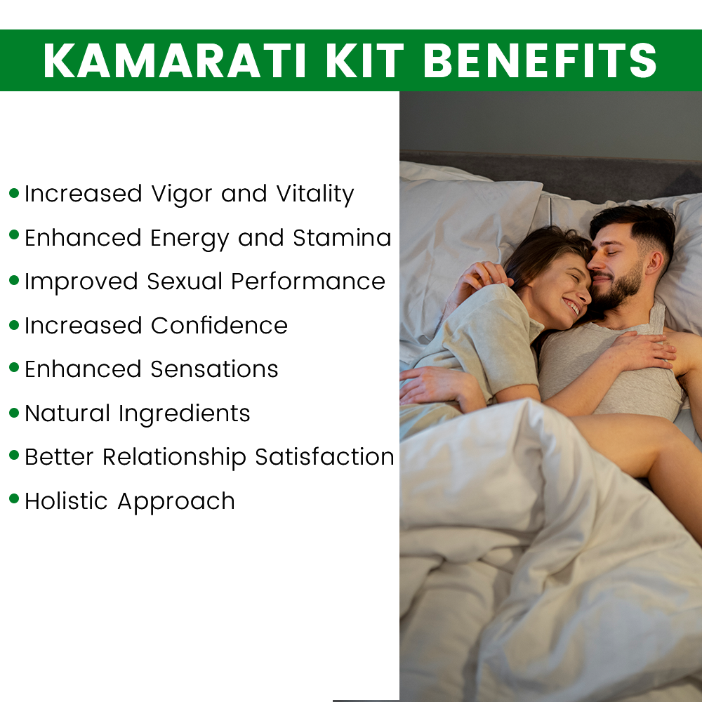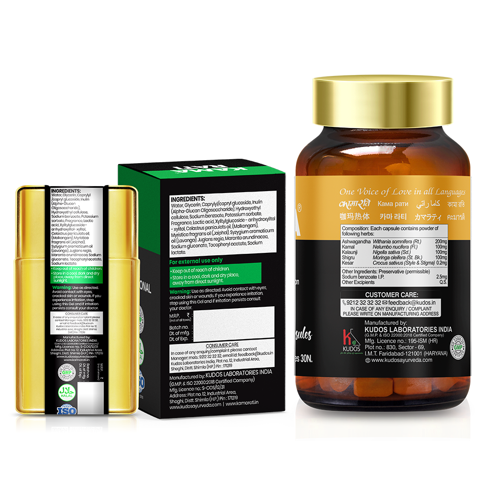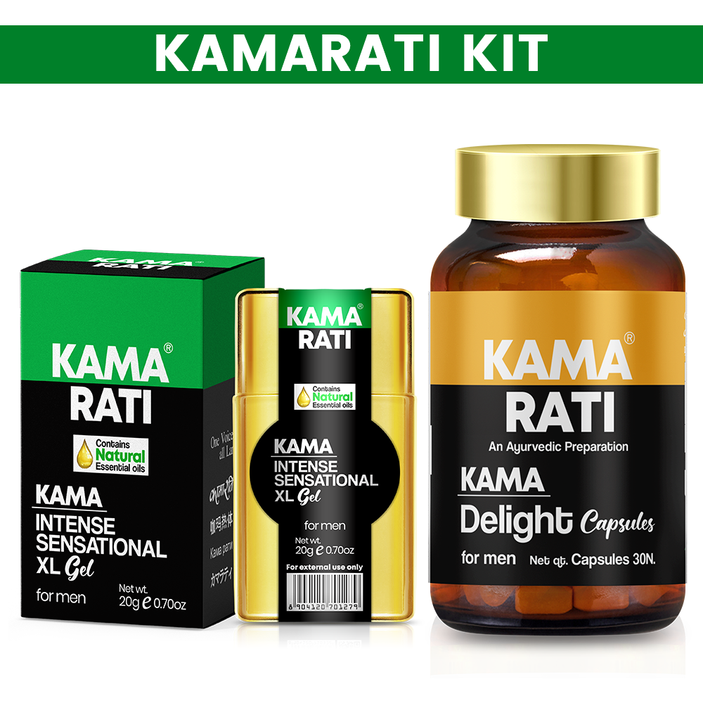 The Kamarati Kit is a dual-action Ayurvedic wellness system designed to enhance intimate health, vigor, and overall vitality. This comprehensive kit combines internal nutritional support with topical stimulation to address physical fatigue and improve performance. The system typically includes Kama Delight Capsules, which work internally to replenish energy reserves and build endurance, and Kama Intense Sensational XL Gel, which provides targeted topical stimulation. Formulated with a blend of potent aphrodisiac herbs and revitalizing nutrients, the Kamarati Kit offers a holistic, chemical-free approach to restoring confidence and intensifying pleasure for a more fulfilling intimate life.