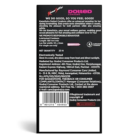 KamaSutra Dotted Condom is specially designed to enhance pleasure while providing reliable protection during sexual activity. The dotted texture helps increase stimulation, and the premium quality latex material ensures effective protection against unintended pregnancy and sexually transmitted infections (STIs) when used correctly.