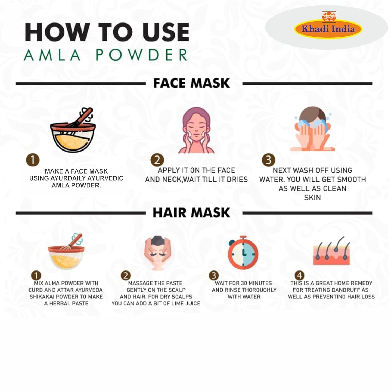 - Mix 2-3 tablespoons of Amla powder with warm water or curd to form a smooth paste. Apply to the scalp and hair, leave for 30-45 minutes, and rinse thoroughly with plain water.