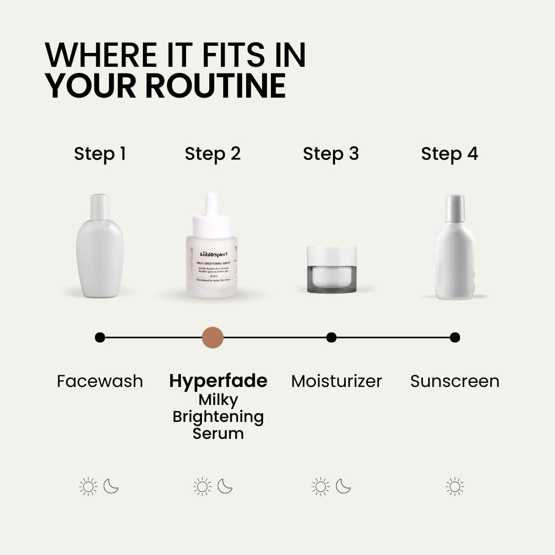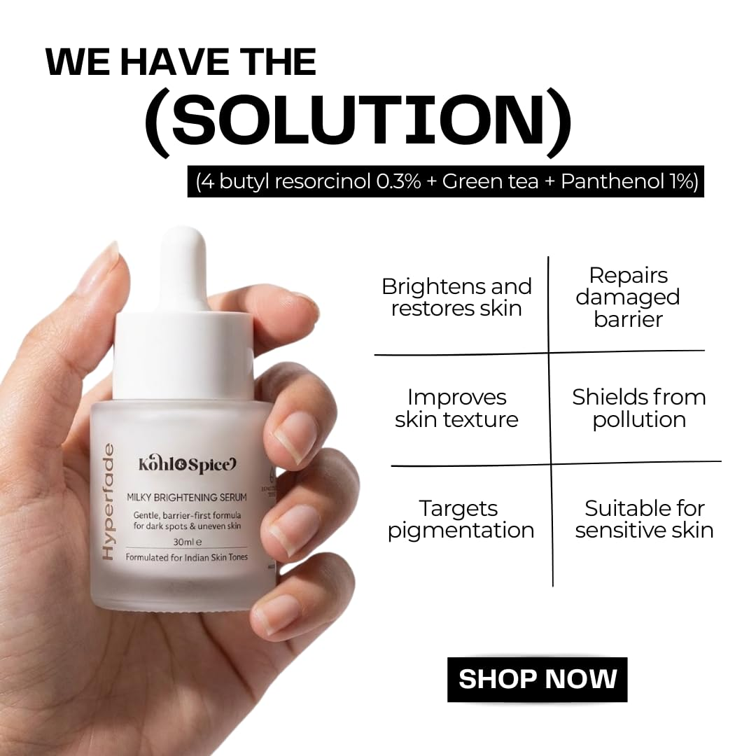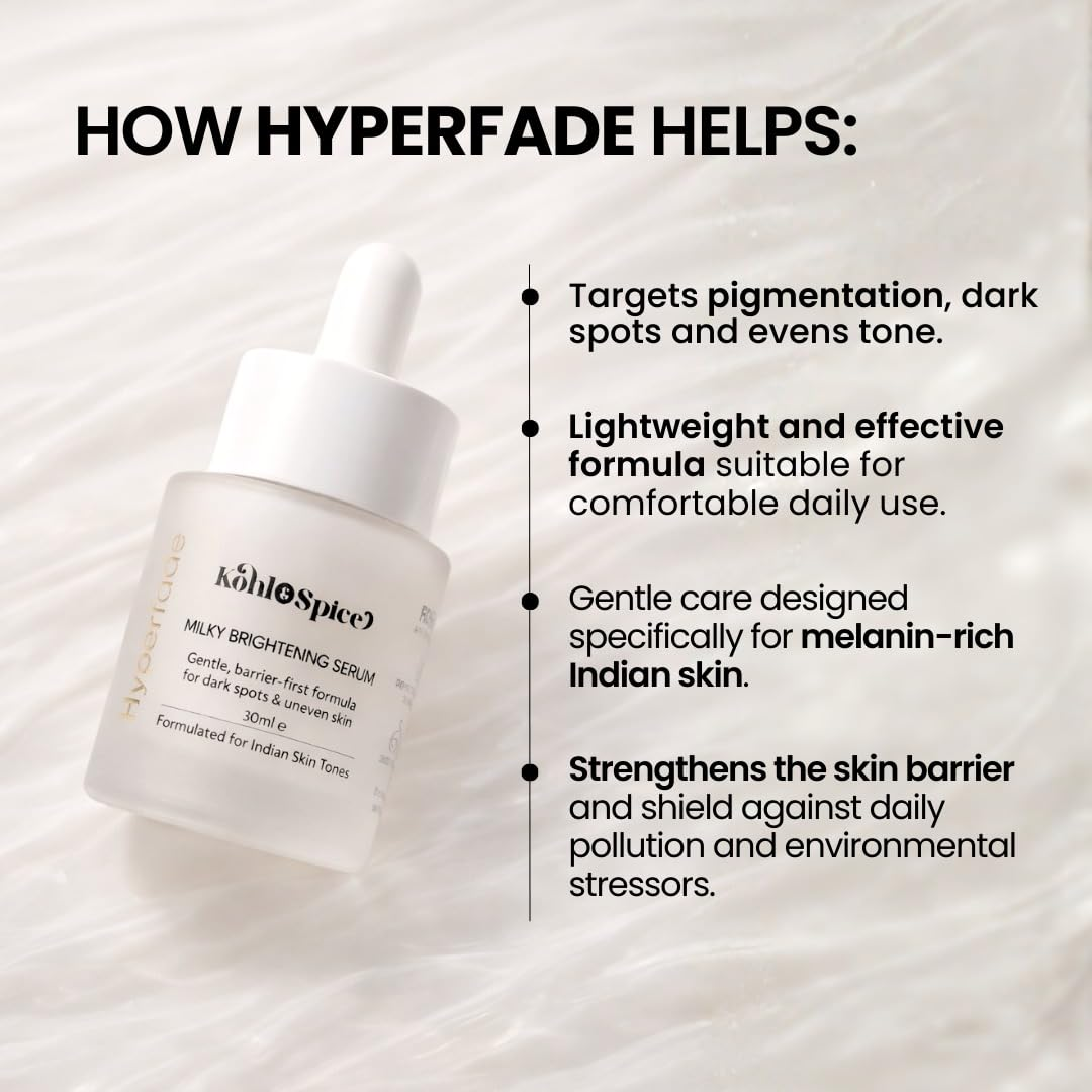 Legal Disclaimer: Kohl & Spice HyperFade Milky Brightening Serum is a specialized cosmetic-pharmaceutical product. Individual results vary based on the depth of pigmentation and skin type. This product is not intended for the treatment of dermatological diseases like vitiligo. This information is for educational purposes and is not a substitute for professional medical consultation or a personalized skincare treatment plan.