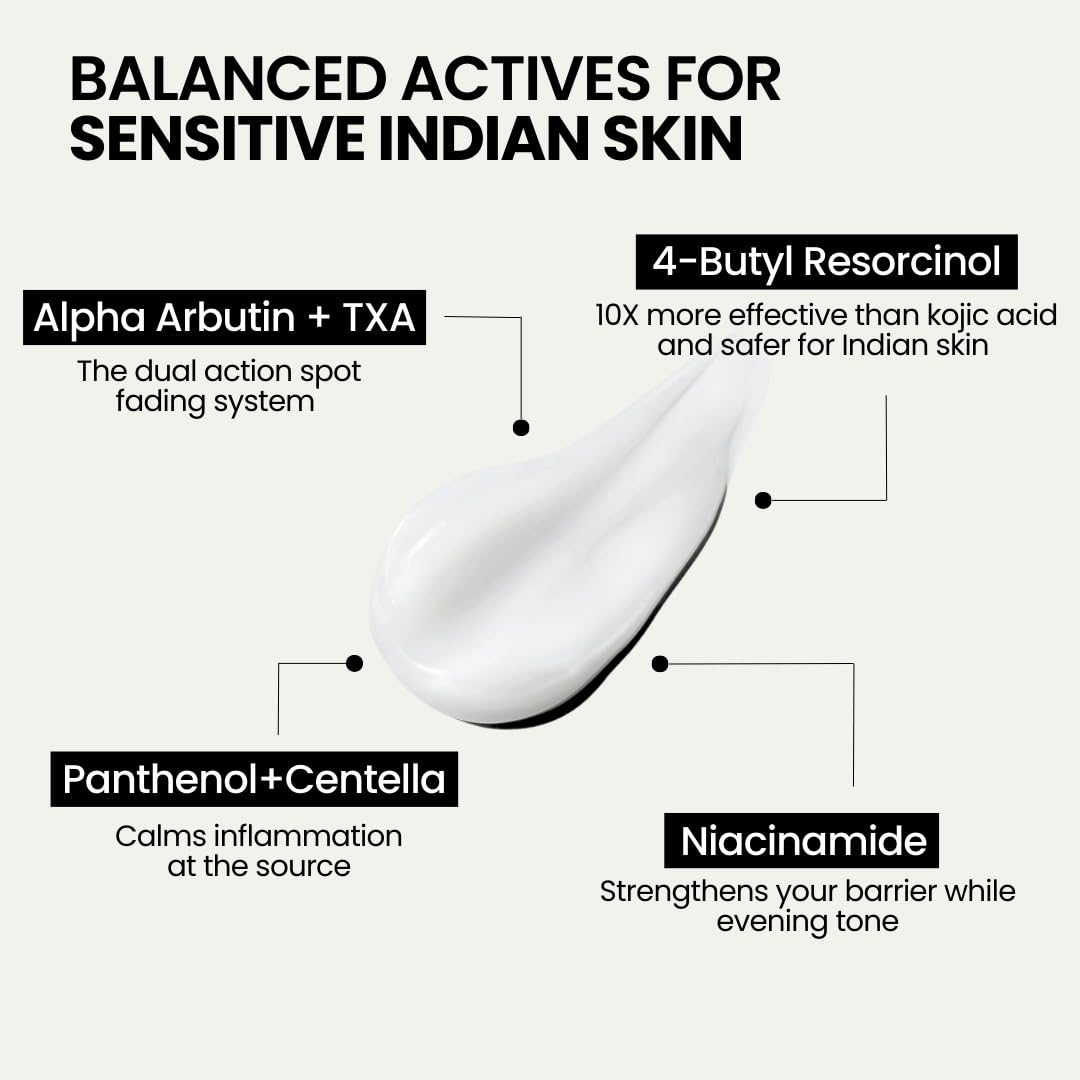 Kohl & Spice HyperFade Milky Brightening Serum is a high-performance dermatological intervention containing a synergistic complex of Alpha Arbutin, Niacinamide, and Tranexamic Acid, specifically engineered for the clinical management of melasma, solar lentigines, and post-inflammatory hyperpigmentation (PIH). Utilizing a unique “Milky-Emulsion” delivery system, this serum works by interrupting the melanogenesis pathway at multiple cellular stages. By inhibiting tyrosinase activity and blocking the transfer of melanosomes to keratinocytes, HyperFade effectively reduces the concentration of surface pigment. This targeted biochemical action provides a decisive therapeutic response by fading stubborn dark spots and preventing the formation of future discolorations without the rebound effects associated with harsher bleaching agents.