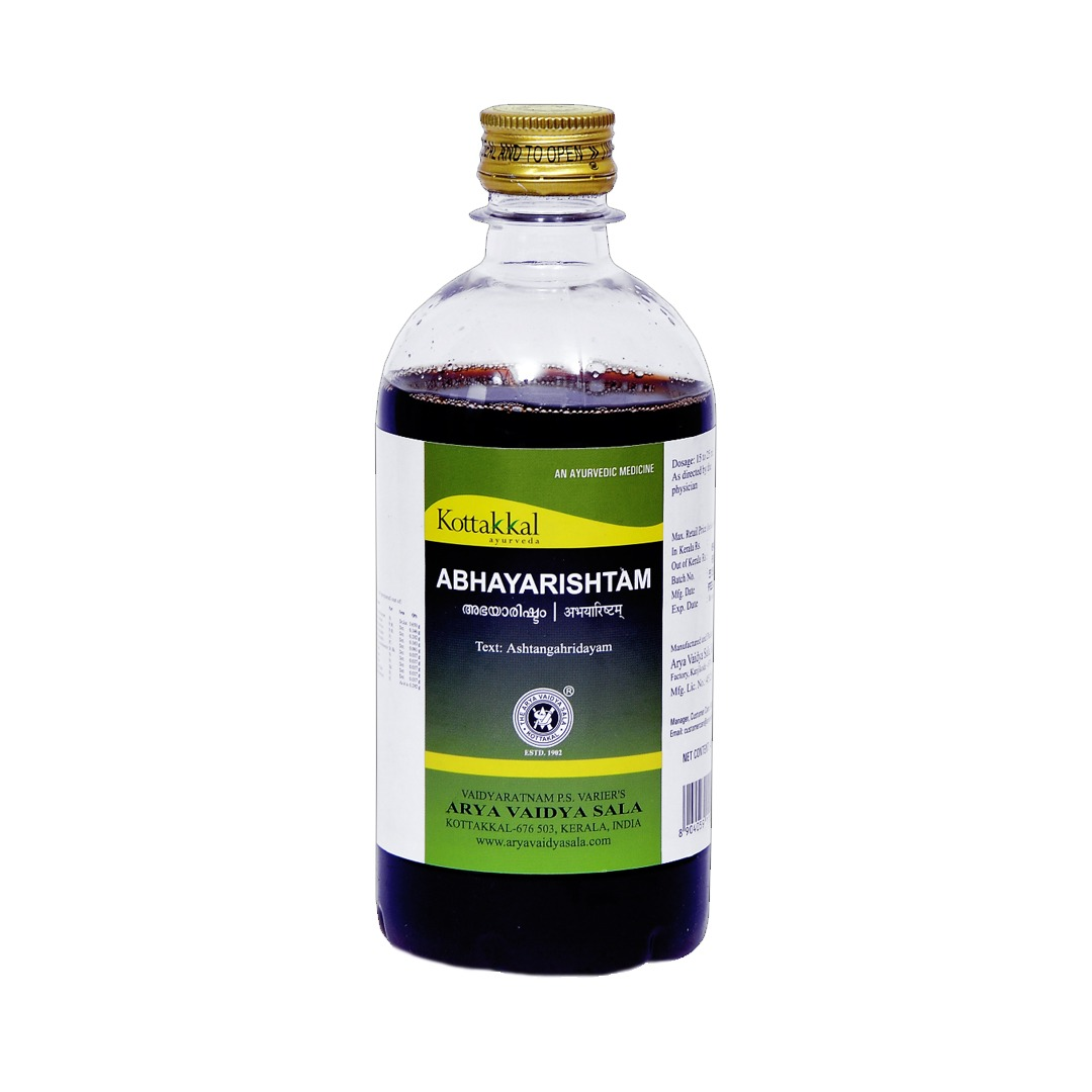 Kottakkal Abhayarishtam is a classical Ayurvedic fermented liquid formulation traditionally used to support digestive health and bowel regularity. It is commonly recommended for constipation, bloating, abdominal discomfort, and digestive imbalance. This formulation helps improve gut function and promotes natural cleansing when used as advised by an Ayurvedic physician.