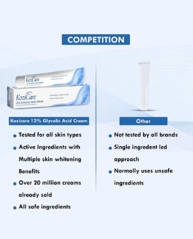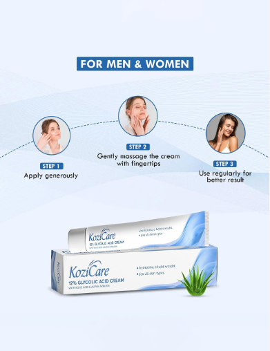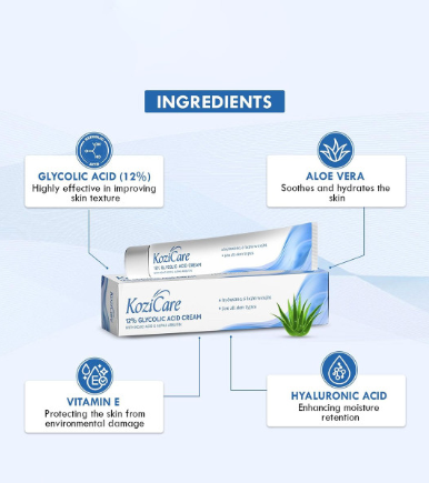 Enhance your skin’s clarity with Kozicare 12% Glycolic Acid Face Cream. It helps refine pores, brighten skin tone, and support smoother, youthful-looking skin texture.