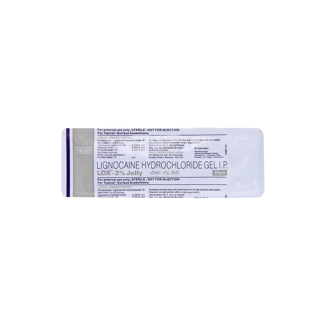 Lox 2% Jelly is a topical local anesthetic gel used to numb the skin or mucous membranes to reduce pain, discomfort, and sensitivity during minor procedures or interventions. It is commonly applied before injections, needle insertions, minor surgical procedures, or surface irritations to provide temporary anesthesia and improve patient comfort. Lox 2% Jelly should be used as directed by a healthcare professional.
