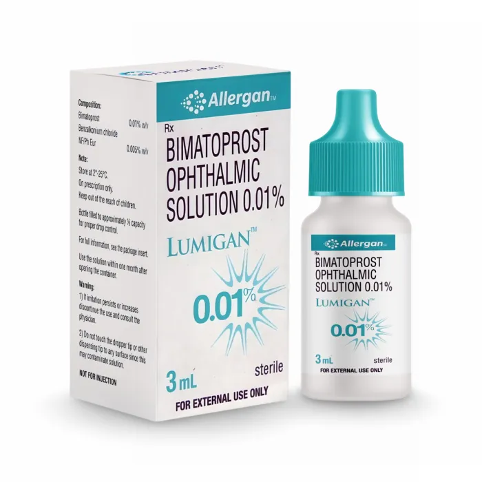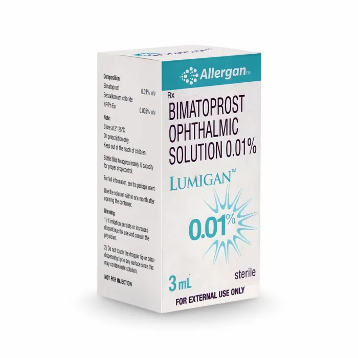 Lumigan 0.01% Ophthalmic Solution is a prescription eye drop used to lower elevated intraocular pressure in patients with glaucoma or ocular hypertension. It works by increasing the outflow of aqueous humor from the eye, thereby reducing eye pressure and protecting the optic nerve from damage. Lumigan may also cause eyelash growth as a secondary effect. It should be used strictly under the guidance of an eye care professional.