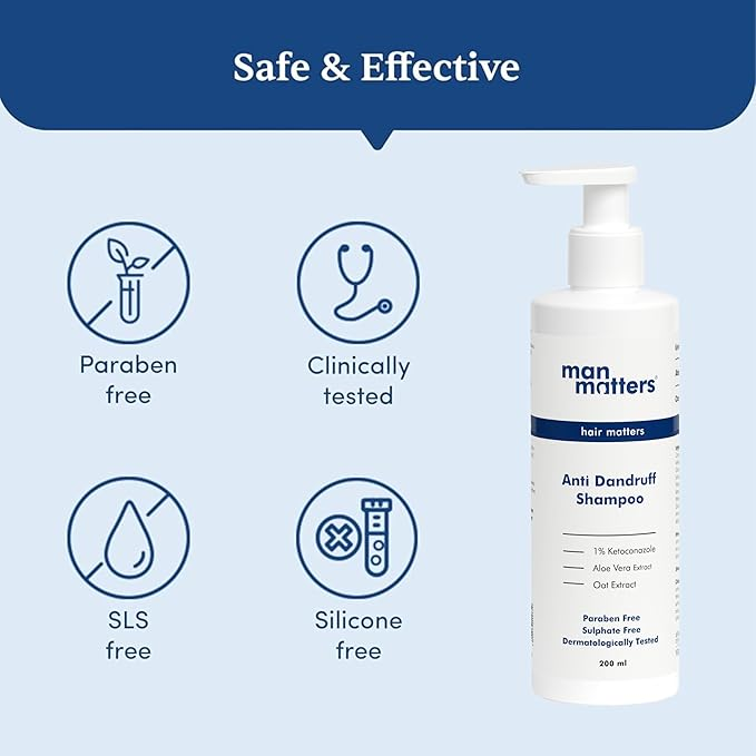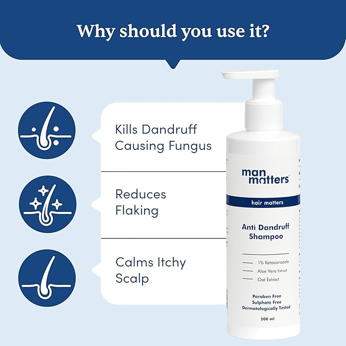 Man Matters Anti-Dandruff Shampoo is a clinically backed hair care solution specifically engineered for men to combat stubborn flakes and scalp irritation. This dermatologically tested formula features 1% Ketoconazole, a powerful antifungal agent that targets Malassezia globosa—the fungus primarily responsible for dandruff. Unlike harsh chemical shampoos, it is enriched with soothing botanical extracts like Aloe Vera and Oat Extract to maintain scalp hydration and prevent post-wash dryness. It effectively clears buildup, reduces redness, and provides a 3X faster reduction in itching. Free from parabens and sulfates, it is suitable for all hair types and is designed to restore a clean, healthy scalp environment while strengthening hair from the roots.
