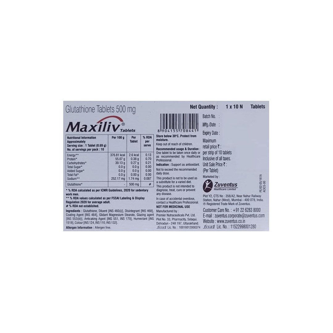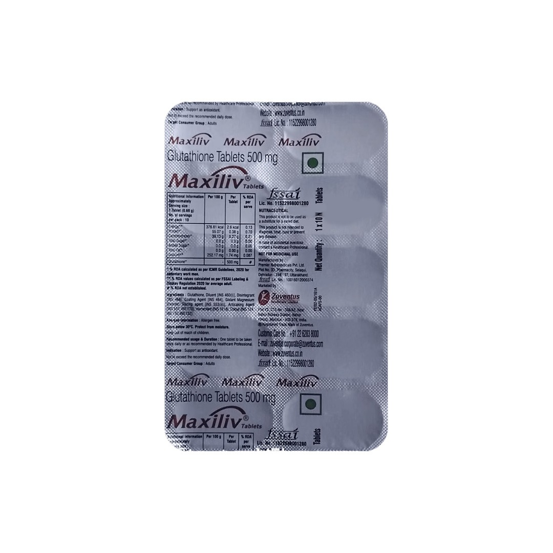 Maxiliv Glutathione Tablet for Adults is a nutritional supplement formulated to support liver health, antioxidant protection, and overall wellness. It contains glutathione, a powerful antioxidant that helps neutralize free radicals, supports detoxification, and promotes healthy skin and immunity. This tablet is suitable for adult use as recommended by a healthcare professional.