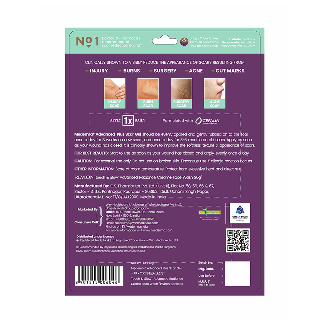 Mederma Advanced Plus Scar Gel 10gm is a clinically formulated scar care gel designed to help reduce the appearance of scars caused by surgery, injury, burns, acne, and cuts. Its advanced formula helps improve skin texture, soften scars, and reduce discoloration with regular use. This special pack also includes a free Revlon Face Wash to support daily cleansing and skincare routine.
