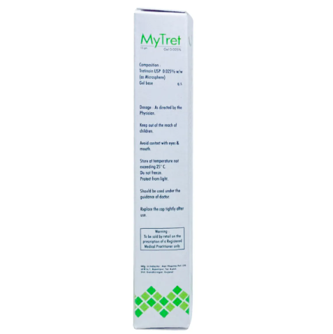 Mytret 0.025% Gel contains tretinoin, a vitamin A derivative that unclogs pores and controls oil secretion, preventing pimples and improving skin texture.