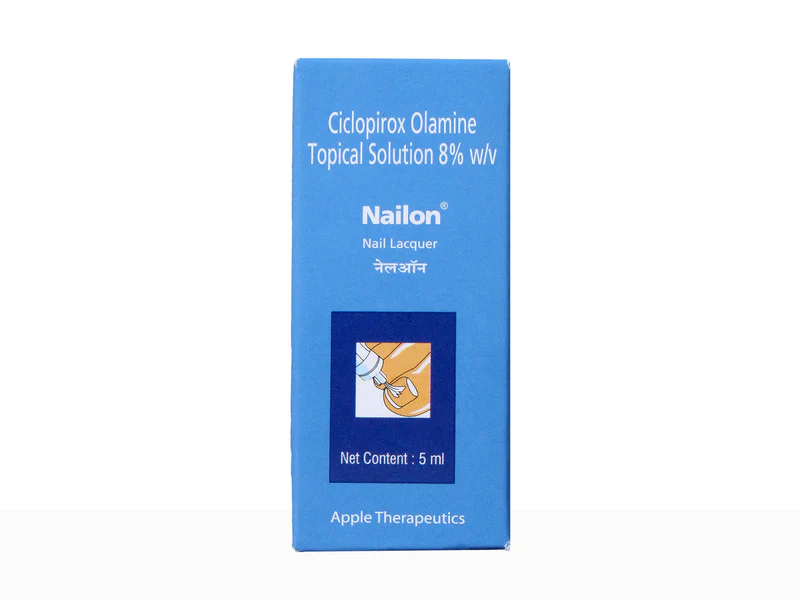 Nailon Nail Lacquer is a medicated nail lacquer used for the treatment of fungal infections of the nails (onychomycosis). It works by inhibiting the growth of fungus and helps clear nail infections when used regularly as directed. The lacquer forms a protective film over the nail, allowing the medicine to penetrate deeply and act effectively.
