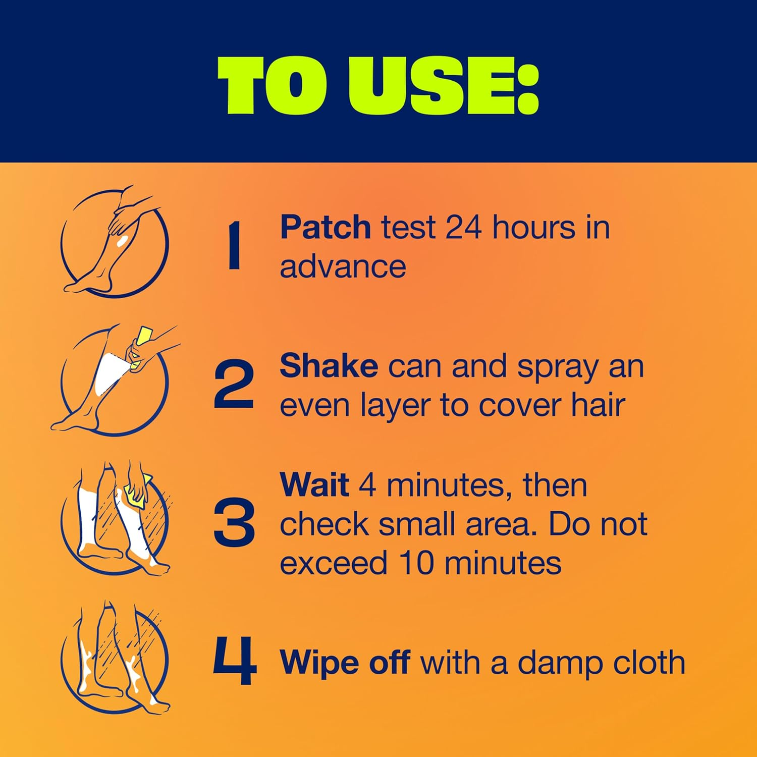 - After 4 minutes, wipe a small test area. If the hair does not come away easily, leave for a few more minutes (do not exceed 10 minutes total).