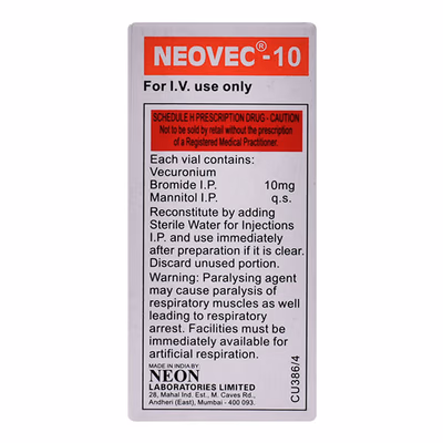 Neovec 10mg Injection is a prescription medicine containing Vecuronium bromide, a neuromuscular blocking agent. It is used as part of general anesthesia to provide skeletal muscle relaxation during surgical procedures and to assist with procedures such as endotracheal intubation. This injection is administered only by a qualified healthcare professional in a clinical setting.