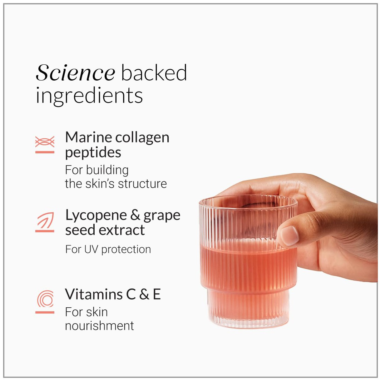 - Hydrolyzed Collagen Peptides – Supports skin elasticity, hair strength, and joint health.