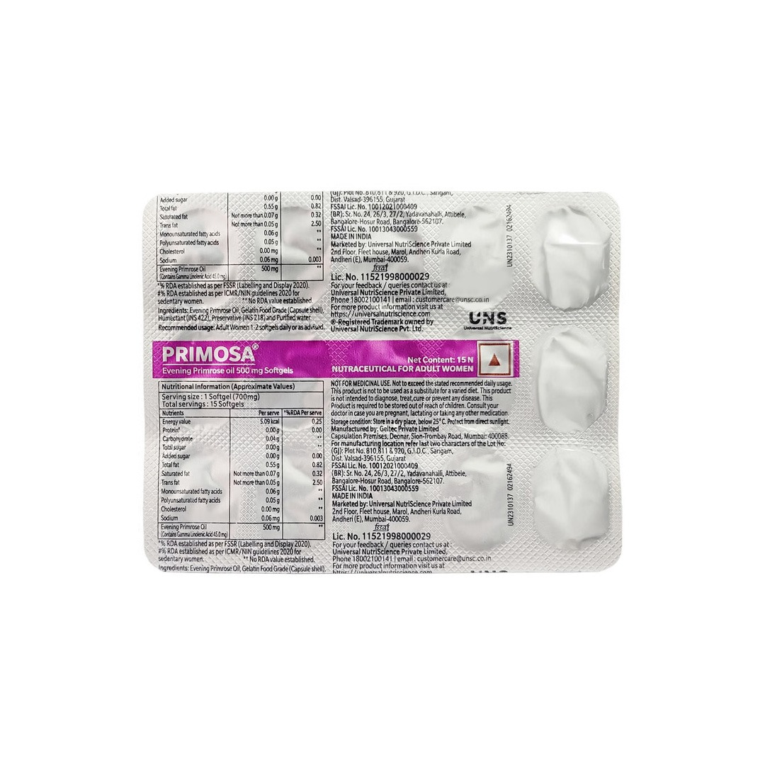 Primosa 500mg Evening Primrose Oil Softgel is a nutritional supplement specially formulated to help manage symptoms of premenstrual syndrome (PMS). It contains Evening Primrose Oil, a rich source of gamma-linolenic acid (GLA), which helps support hormonal balance, reduce breast pain, and ease menstrual discomfort. Regular use promotes overall women’s health and well-being.
