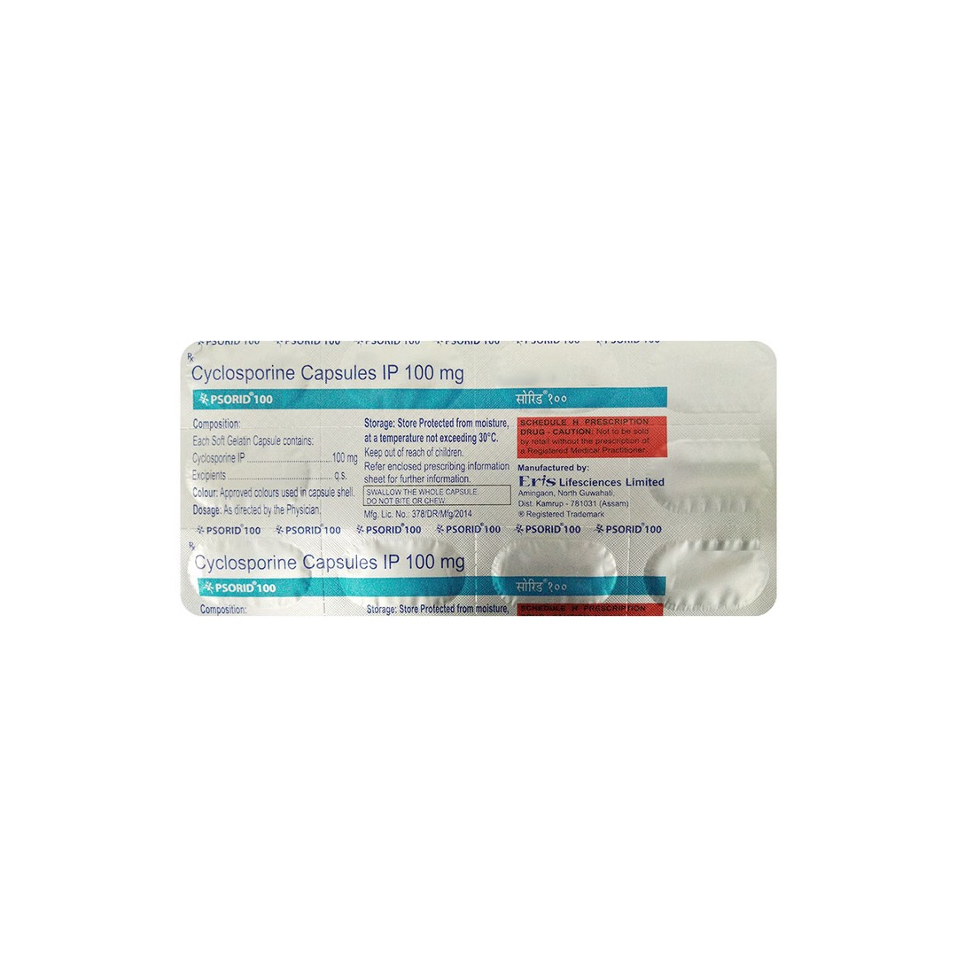 Psorid 100mg Capsule is a prescription immunosuppressant medicine containing Ciclosporin. It is used to prevent rejection of transplanted organs such as the kidney, liver, or heart, to treat severe psoriasis, to manage rheumatoid arthritis, and toaddress certain immune-mediated conditions under strict medical supervision. This medicine works by suppressing the immune system’s activity to reduce inflammation and prevent harmful immune reactions.