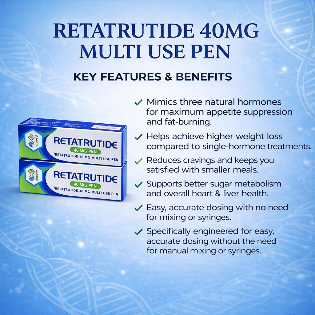 Retatrutide 40mg is a high-strength, “Triple-Action” weight management treatment delivered in a convenient, easy-to-use pre-filled pen. This breakthrough medicine is unique because it targets three different natural hormones in your body (GLP-1, GIP, and Glucagon) to regulate appetite and metabolic speed. Specifically engineered for individuals who require a more robust clinical response, the 40mg pen acts as a powerful therapeutic tool to help reset the bodyโs weight set point and improve long-term energy balance. The real clinical excellence of the Retatrutide 40mg Pen lies in its “Triple-Agonist” profile. While older medications only focus on one or two hormone pathways, this 40mg dose provides a comprehensive response by simultaneously reducing hunger, increasing the feeling of fullness, and helping the body burn fat more efficiently. It effectively neutralizes “food noise” (the constant urge to snack), helping you stay satisfied with smaller, healthier portions. under professional medical guidance.