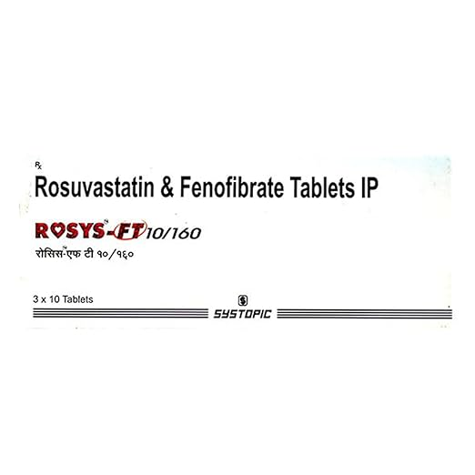 Rosys-FT 10/160 is a high-potency, dual-action lipid-regulating intervention containing a specialized combination of Rosuvastatin (10 mg) and Fenofibrate (160 mg). Specifically engineered for the clinical management of mixed dyslipidemia and severe hypertriglyceridemia, Rosys-FT works by targeting two distinct metabolic pathways of cholesterol and triglyceride synthesis. Rosuvastatin, a potent HMG-CoA reductase inhibitor (statin), acts as a decisive therapeutic response by blocking the primary enzyme responsible for hepatic cholesterol production. Simultaneously, Fenofibrate, a fibric acid derivative, activates the Peroxisome Proliferator-Activated Receptor-alpha (PPARα), effectively facilitating the breakdown of triglyceride-rich particles and increasing the levels of high-density lipoprotein (HDL) or “good” cholesterol.