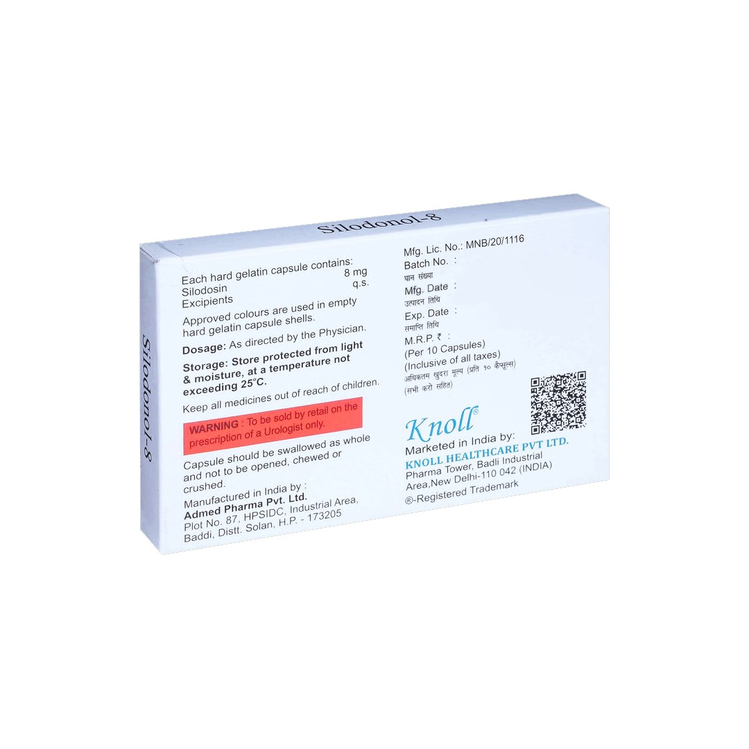 Silodonol 8mg Capsule is a prescription medicine used in the treatment of benign prostatic hyperplasia (BPH), a condition where the prostate gland becomes enlarged. It contains Silodosin, which works by relaxing the muscles of the bladder and prostate, helping improve urine flow and reducing symptoms such as difficulty in urination, weak stream, and frequent urination.