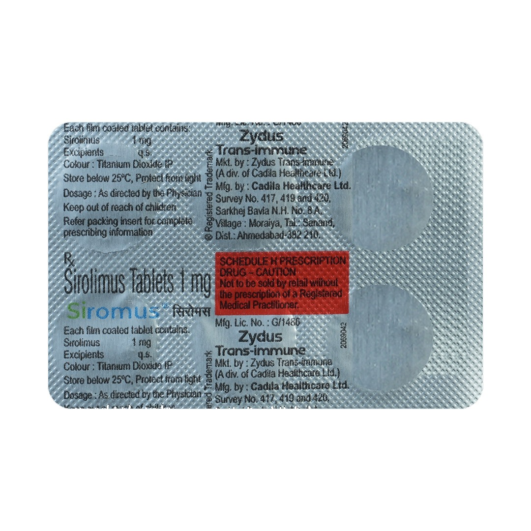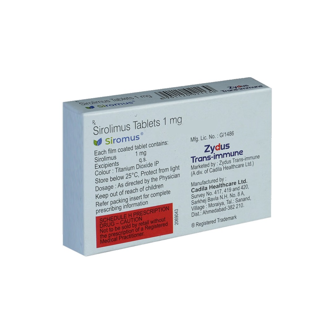Siromus 1mg Tablet contains sirolimus and is an immunosuppressant medicine used to prevent organ rejection after kidney transplantation. It works by suppressing the immune system so that the transplanted organ is accepted and functions properly. It may also be used for certain rare conditions as advised by a doctor.