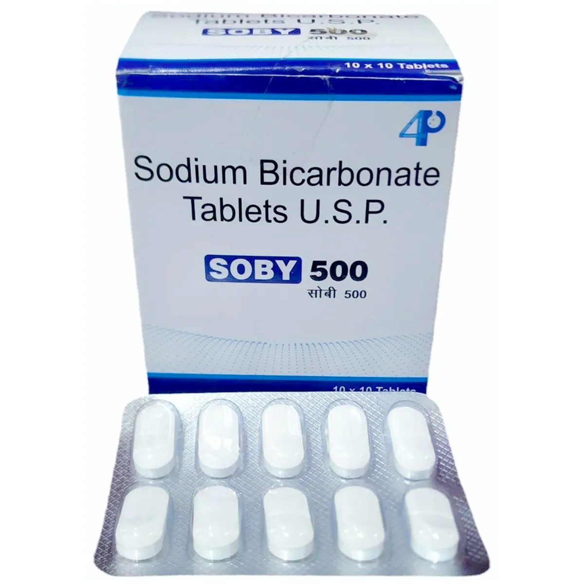 Soby 500 Tablet is a medicine used in the management of metabolic acidosis, including diabetic ketoacidosis (DKA). It contains Sodium Bicarbonate, which helps neutralize excess acid in the blood and restores the body’s normal pH balance. It is prescribed under strict medical supervision, especially in emergency or hospital settings.
