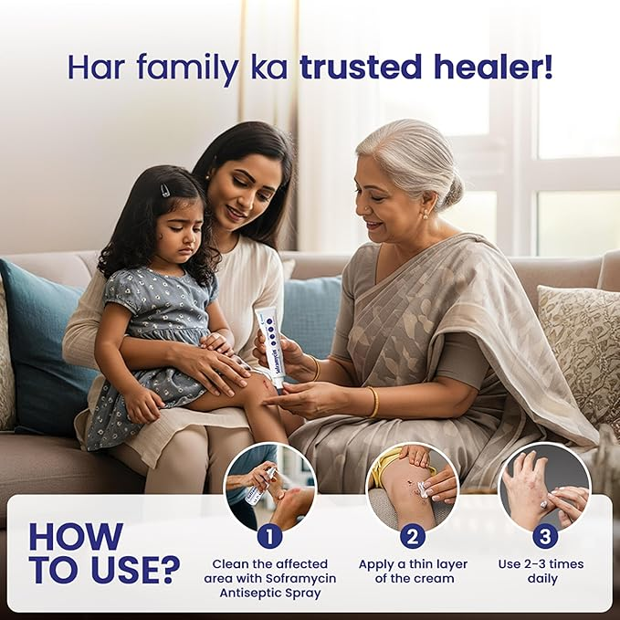 Soframycin Multi-Purpose Antiseptic Cream is a topical antibiotic used to prevent and treat minor skin infections caused by cuts, wounds, burns, abrasions, and insect bites. It helps kill infection-causing bacteria and promotes faster healing of the affected area when used as directed by a healthcare professional.