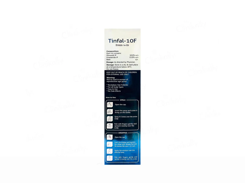 Tinfal-10F Topical Solution is a medicated hair treatment formulated to address hair thinning and promote healthy hair growth. It works by nourishing hair follicles, strengthening hair from the roots, and reducing hair fall. This solution is ideal for individuals experiencing early hair loss or thinning hair.