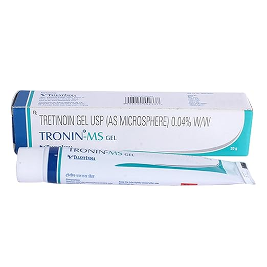 Tronin MS Gel contains Tretinoin (0.04% w/w), a vitamin A derivative used to treat acne, wrinkles, and rough skin. It unclogs pores, promotes cell turnover, and helps reduce acne scars for clearer skin.