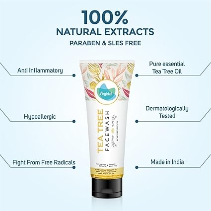 Vegetal Tea Tree Face Wash is a gentle yet effective facial cleanser formulated to help remove excess oil, dirt, and impurities while soothing problem skin. With tea tree extract known for its natural antibacterial properties, this face wash supports clearer, fresher-looking skin when used regularly as part of your skincare routine.