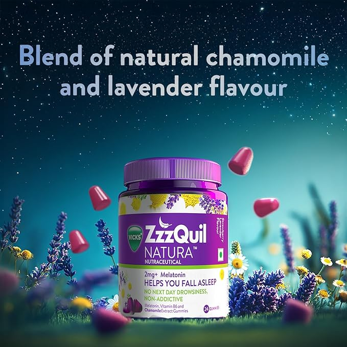 Vicks ZzzQuil Natura is a non-habit-forming dietary supplement designed to help you fall asleep naturally and wake up feeling refreshed. Unlike traditional sleep medications, these gummies use a specialized blend of Melatonin and botanical extracts to support the body’s natural sleep cycle. Melatonin helps regulate the circadian rhythm, signaling to the body that it is time to rest, while the herbal infusion of Lavender, Chamomile, and Valerian root provides a calming effect to reduce nighttime restlessness. Formulated as a delicious strawberry-lavender flavored gummy, it offers a convenient and drug-free way to manage occasional sleeplessness, jet lag, or disrupted sleep schedules without the risk of next-day grogginess.