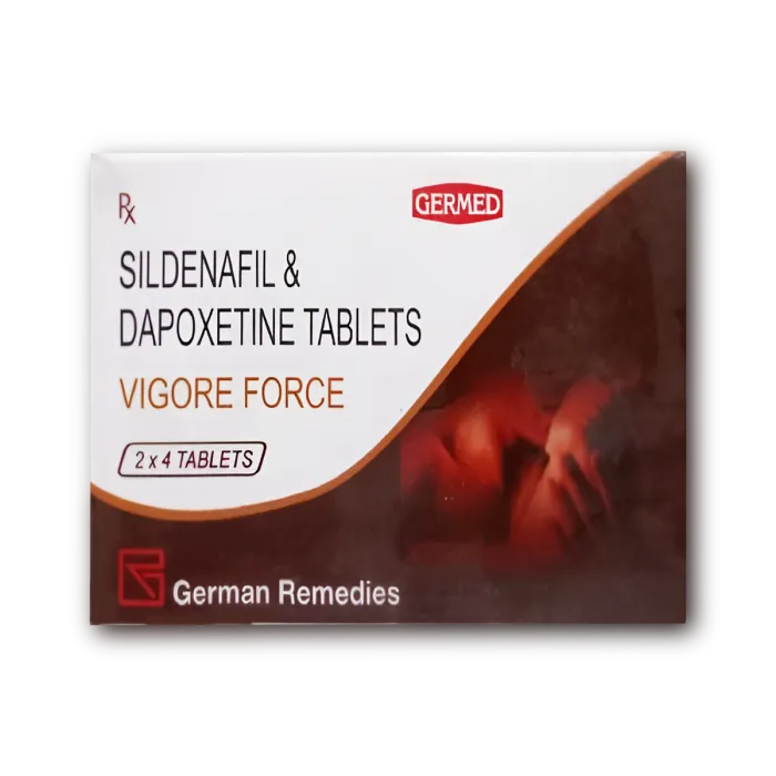 Vigore Force 80 mg is a specialized “dual-action” combination medication designed to address two common aspects of male sexual health: erectile dysfunction (ED) and premature ejaculation (PE). It contains two active ingredients: Sildenafil (50 mg) and Dapoxetine (30 mg). Sildenafil, a PDE5 inhibitor, works by increasing blood flow to the penis to achieve a firm erection, while Dapoxetine, a selective serotonin reuptake inhibitor (SSRI), helps increase the time it takes to ejaculate and improves control over ejaculation. This synergistic blend allows for enhanced performance, better timing, and increased sexual satisfaction in a single, convenient dose.