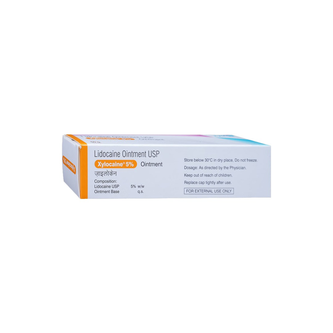 Xylocaine 5% Ointment contains Lidocaine, a local anesthetic that temporarily numbs the skin to relieve pain and itching. It is commonly used for minor burns, sunburn, insect bites, skin abrasions, haemorrhoids, and other painful or irritated skin conditions.